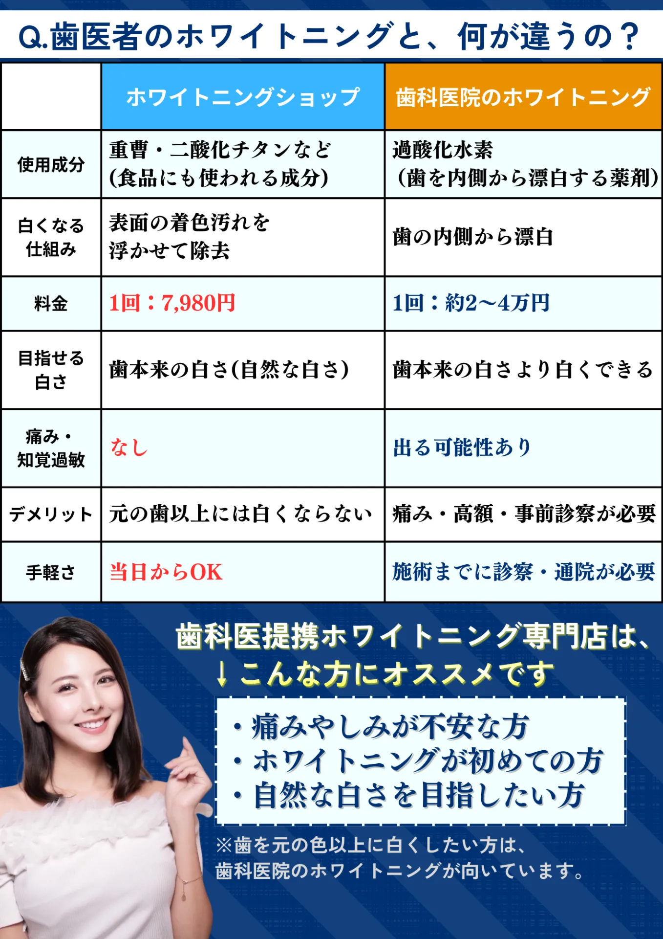 歯医者のホワイトニングでは、[過酸化水素]という刺激が強い薬剤を使用するため痛みを感じたり知覚過敏になる可能性があります。歯本来の白色以上の白さを目指すお客様にとっては歯医者のホワイトニングが推奨です。