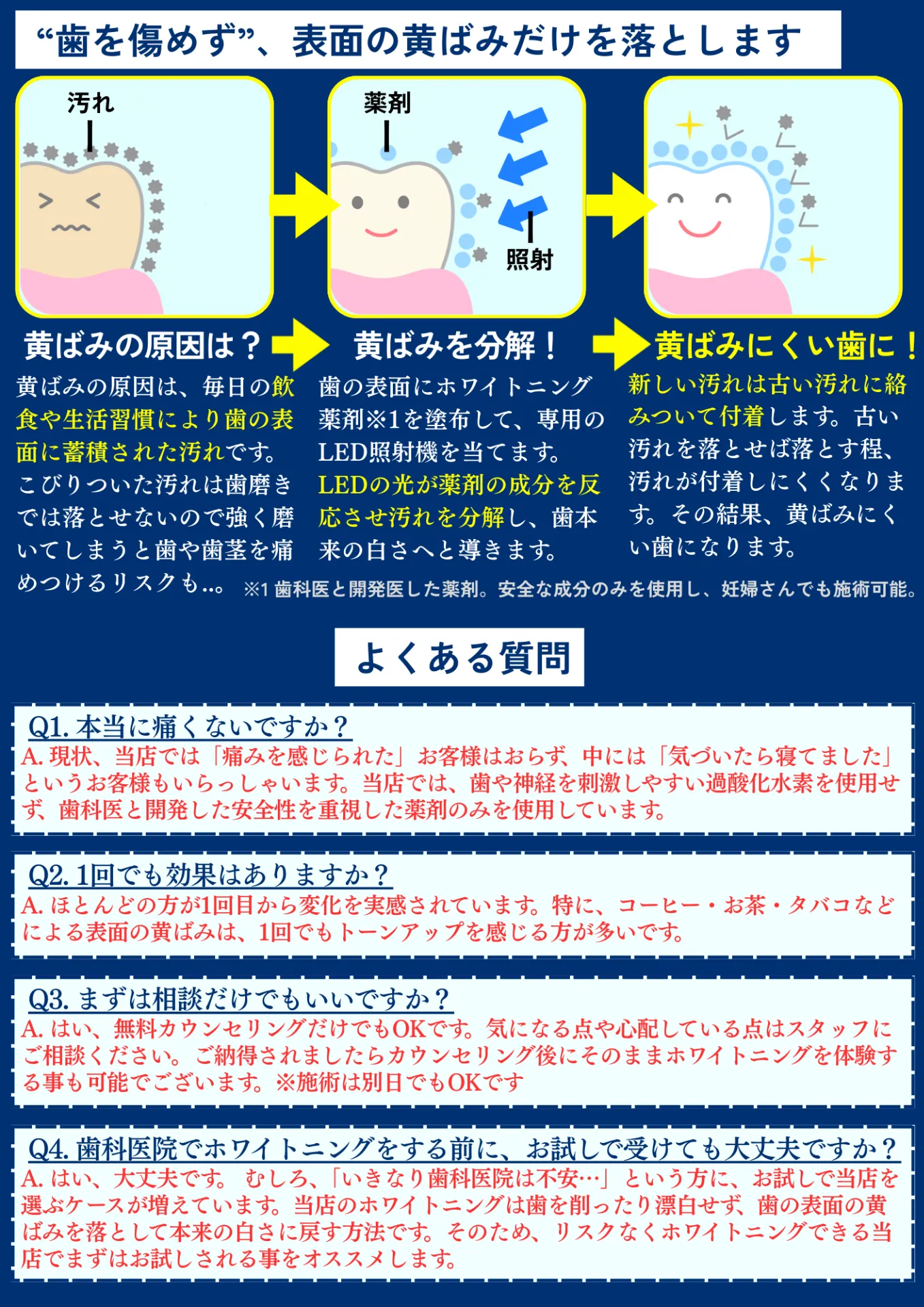 - ございません。当店のホワイトニングでは、食品にも使われる(重曹や二酸化チタンをメイン)成分を使用しているため、痛みや知覚過敏などの副作用について心配無用です。当店は歯科医と提携しておりますため、安全面を配慮しつつ効果をしっかりご実感する事が可能です。